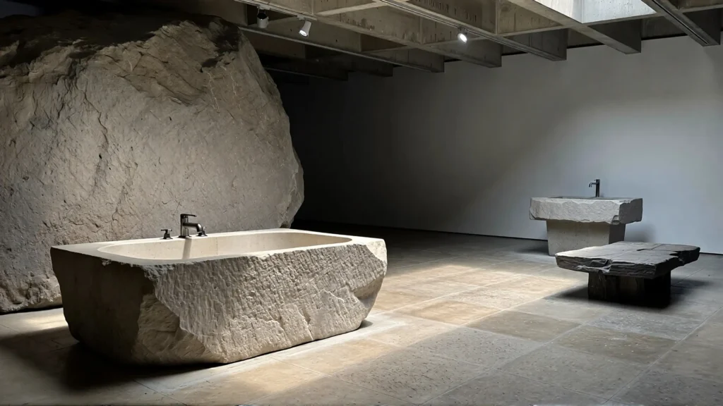 Stone is leaving the floor and climbing onto the furniture. We are not talking about a slab on top of a cabinet. We are talking about solid block sinks, bathtubs carved from a single boulder, and coffee tables that look like raw quarry debris.