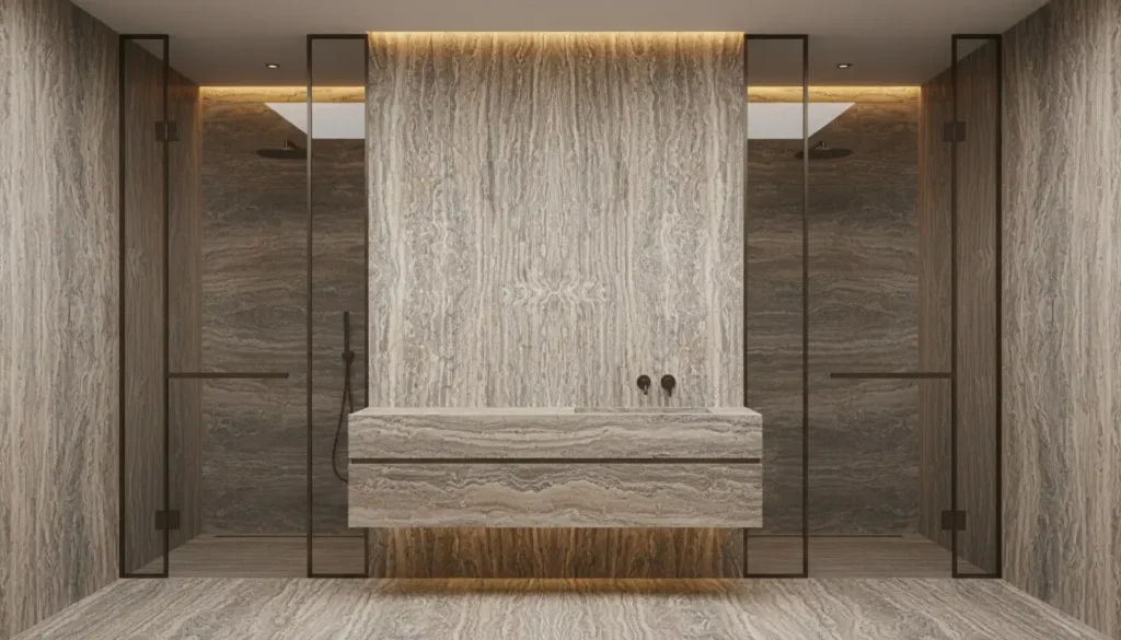 Cool greys are out; warm earth tones are in. This is not the cheap ‘tumbled travertine’ of the 90s. This is Titanium Travertine and Silver Travertine, used in large, vein-cut slabs.