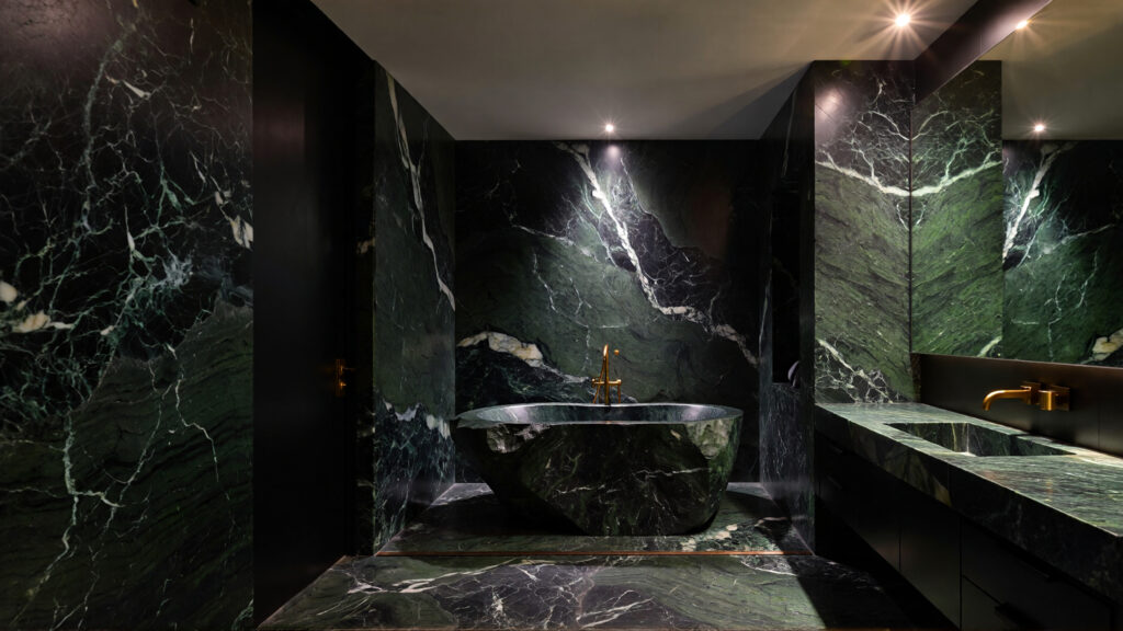 The Vibe: Biophilic design (connecting with nature) is here to stay. Green marble acts as a ‘neutral’ in high-end spaces, pairing perfectly with walnut wood and brass.