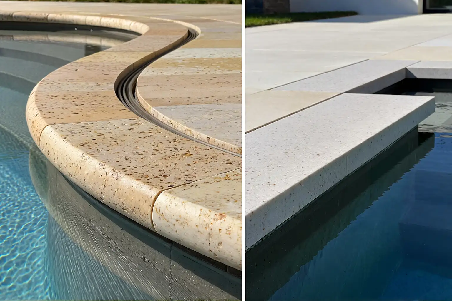 Architectural comparison of pool coping styles showing rounded bullnose edge versus modern drop face stone coping with clean monolithic geometry